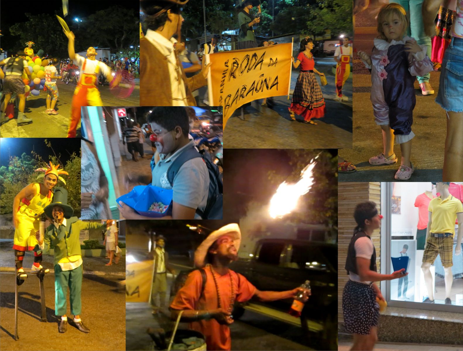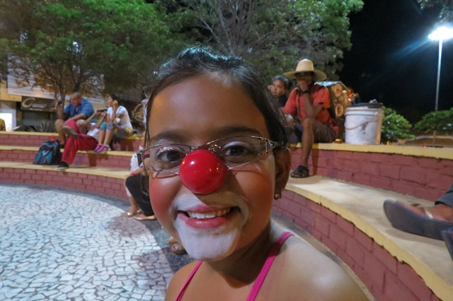 Para esse cortejo, tinha vários palhaços caracterizados, uns distribuindo doces por onde passavam, outros fazendo malabarismos, pernas-de-pau, atores caracterizados de personagens infantis, sertanejo, criança caracterizada de palhaço, até o “cospe fogo” se fez presente. Um cortejo lindo, com poucos artistas, se avaliar a quantidade de pessoas que produzem arte na nossa cidade, porém muito animado e com o intuito realmente de celebrar esse dia.
