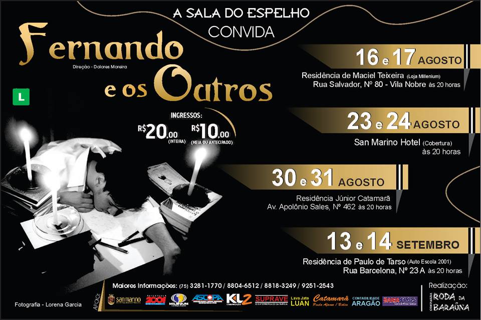 O projeto “A sala do espelho” da Companhia Roda da Baraúna, apresentou ontem pela 4ª vez o espetáculo Fernando e os Outros no  San Marino Hotel. A sala do espelho é um projeto itinerante que busca espaços alternativos criados pela Companhia para exibição de seus espetáculos fazendo com que o teatro vá até o expectador. Uma sacada muito inteligente por parte da produção. “Lacan tem uma técnica de psicanálise onde ele usa o espelho, que é isso de você se enxergar, de você se ver. Quando essa proposta surgiu era porque a gente tava ensaiando na sala que tinha o espelho e a intenção era que no final, quando eu descerrasse a cortina o espelho ia refletir a platéia e eu pensei: “poxa, isso vai ficar incrível!”. Mas a sala lá era pequena e quando a gente começou a ensaiar Fernando e os Outros, só coube o Fernando. Infelizmente não dava e a gente foi percorrendo os espaços e fomos super bem recebidos. Nós tivemos nosso primeiro anfitrião que foi Maciel da Millenium, uma pessoa incrível. Todos os nossos patrocinadores foram pessoas muito sensíveis: Suprave, Auto Escola 2001 KL2 Bahia Frios, Catamara Paulo Afonso, ASCOPA, www.acertepauloafonso.com.br, Lava Jato Luan, Contabilidade Aragão, Mendes Iluminação, Lojas Muillenium e San Marino Hotel.” Diz Dolores Moreira ao descrever o processo de criação do projeto e a formatação do espetáculo.